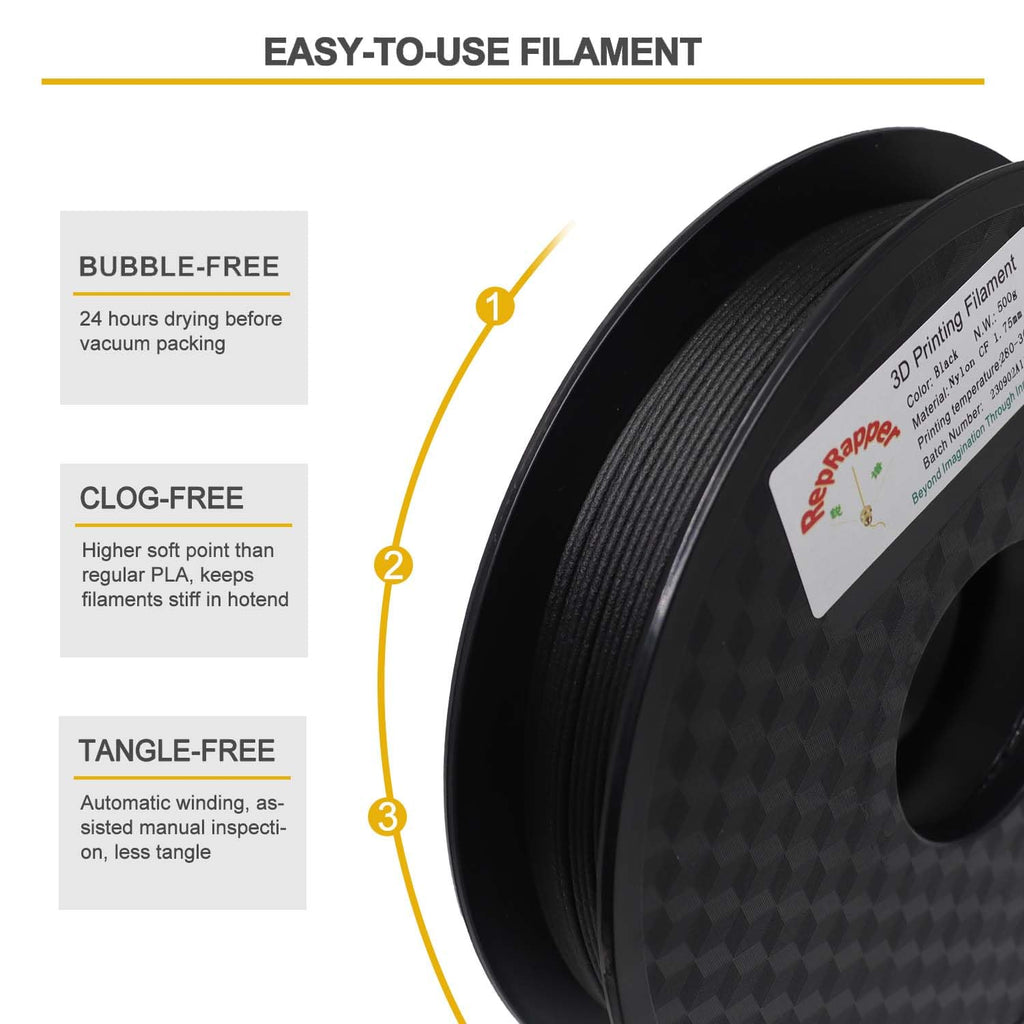 PA6-CF nylon filament is composed of 80% PA and 20% chopped carbon fibers. This carbon fiber reinforcement significantly enhances stiffness, strength, and heat resistance, providing outstanding layer adhesion with a Heat Deflection Temperature of 215°C (ISO 75, 0.45 MPa).