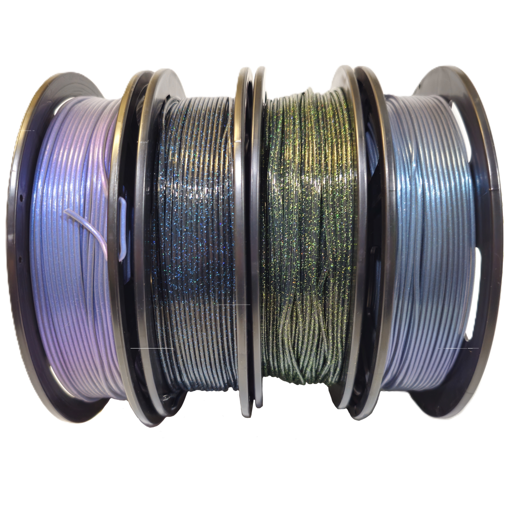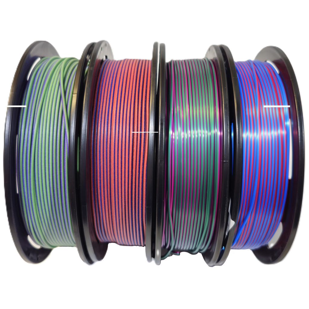 Tri Colour: Includes Rose Red/Blue/Green, Gold/Copper/Black, Purple/Blue/Yellow, and Red/Blue/Gold in Silk PLA. With this pack, you don't need to choose. Enjoy a selection of the most beautiful Tri extrusion PLA silk colours. Perfect for small projects or testing!