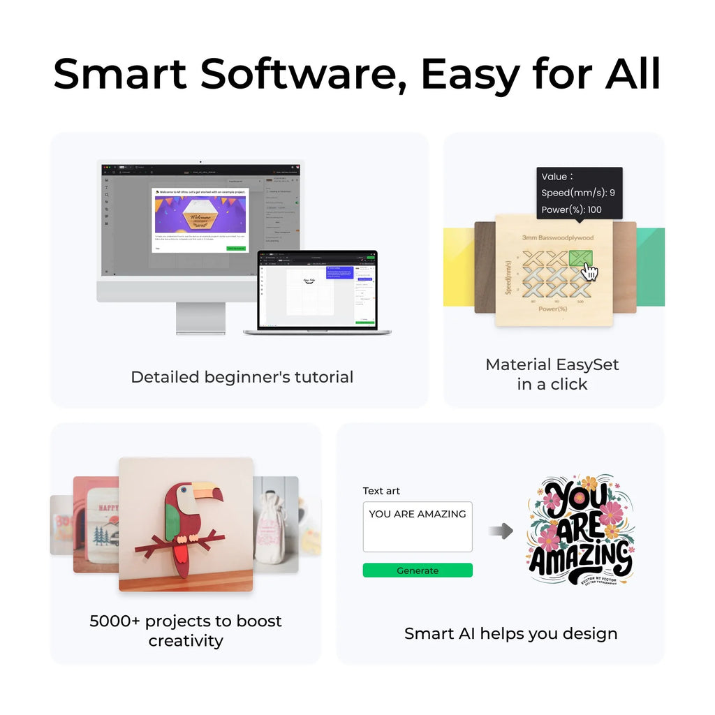 The free xTool Creative Space software helps you get started fast with easy drag-and-drop design tools and preset material settings.