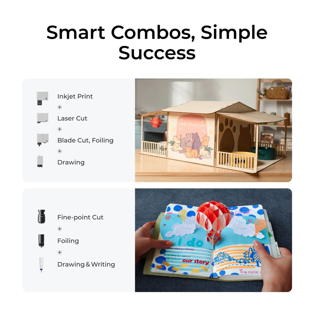 Laser engraving & cutting, blade cutting (for vinyl, paper, fabric), full-color inkjet printing, and pen drawing. Switch modes in seconds and keep creating without limits.